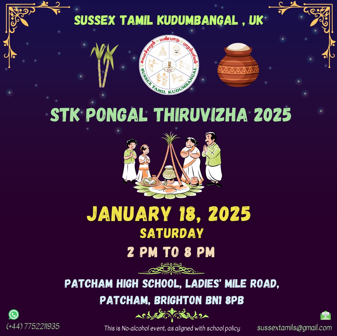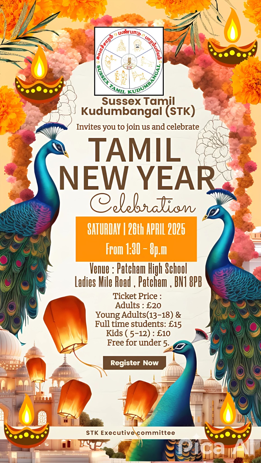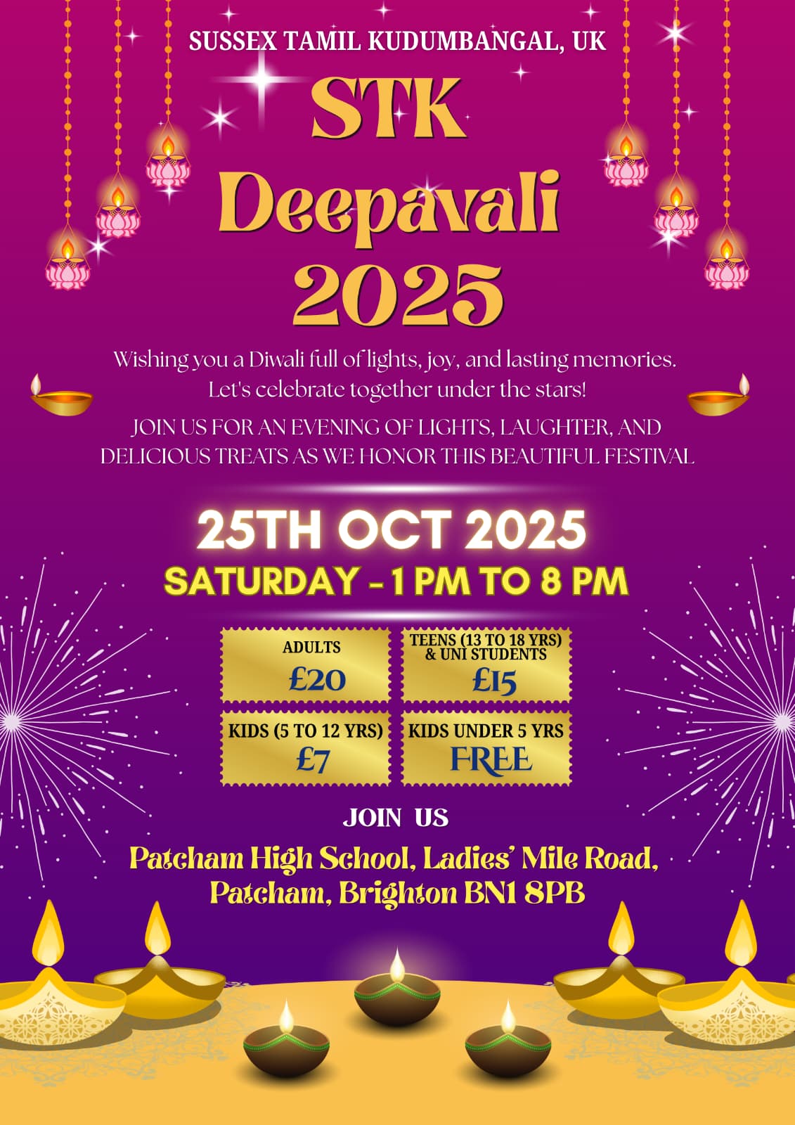 Celebrate Diwali 2025 with the Sussex Tamil Kudumbangal! 🎉 Join us for an unforgettable evening of vibrant cultural performances, mouthwatering Indian cuisine, and joyful togetherness. Let’s light up the night with laughter, tradition, and community spirit.